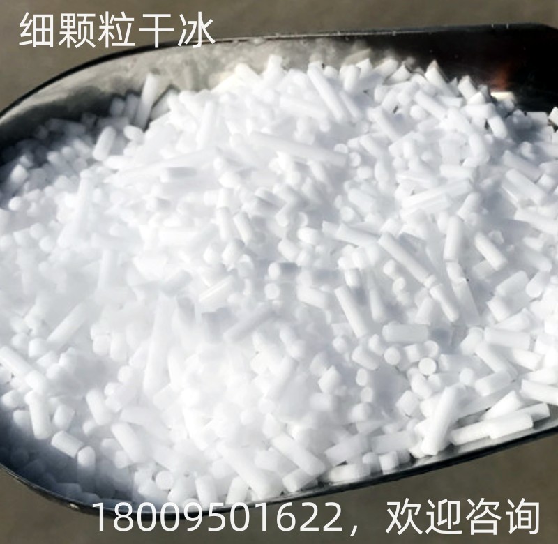 细颗粒干冰为3毫米直径圆柱碎段干冰,同样属于二氧化碳的固态形式,但颗粒体积更小,适用于作为干冰清洗设备的病源。干冰清洗需要将干冰以一定压力和速度喷射到待清洗设备表面,干冰颗粒必须保持较细小状态,干冰在接触设备表面形成一定稀释作用,瞬间液化后再气化,此过程可以清洗油脂、石灰、油漆、锈蚀等各种表面,干冰温度较低的同时,对油脂有稀释作用,可有效清理粘固污渍。
